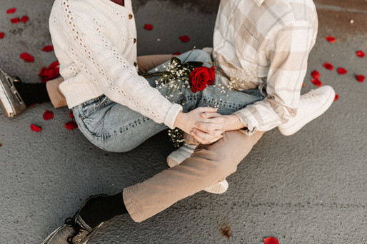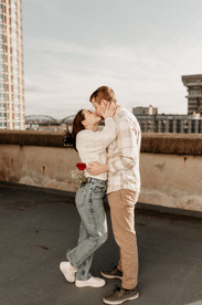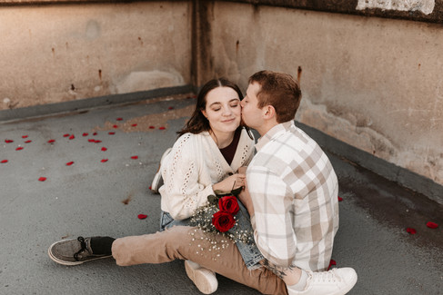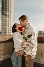 Let's talk about L.O.V.E. loveeeee. I took Elena and Josh to one of my go-to rooftops that's in the center of downtown St.Louis - EPIC! But not as epic as these two are. I love guiding my couples to fall in love with the moment and create a new memory together. Between the roses and piggyback ride, it felt like documenting a movie. Although, it was freezing... The wind blowing through Elena's hair was so beautiful, those became my favorites. If ya didn't have sweets for love day, did it really happen? In the middle of the session, they took a cake break and watched the sunset. Their love story reminds me of a rom-com from all the belly laughs and passion. We ended the evening with flash portraits for a "paparazzi meets celebrity" vibe. It was so much fun recreating a date night on top of the city with them.